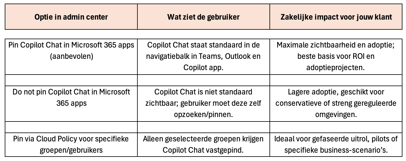 Als reseller kun je pinning meenemen in je adoptieplan: âCopilot staat standaard klaarâ is een concreet, zichtbaar resultaat waar gebruikers direct de waarde van zien, in plaats van alleen een licentie op de achtergrond.