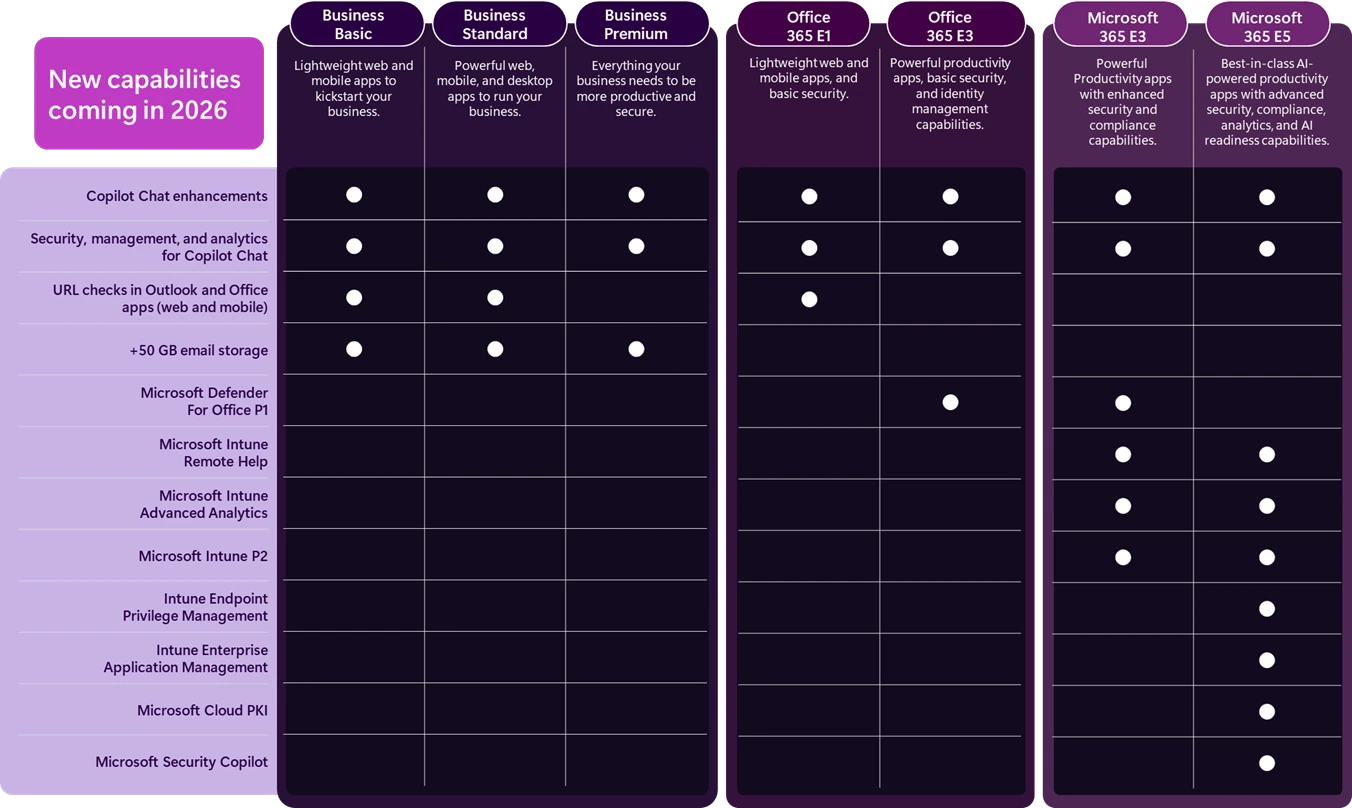 Voor MKB of klanten met E3/Business-plannen: de nieuwe ingebouwde beveiliging en Intune-opties maken het eenvoudiger om compliant en veilig te blijven, zonder aparte extra licenties.